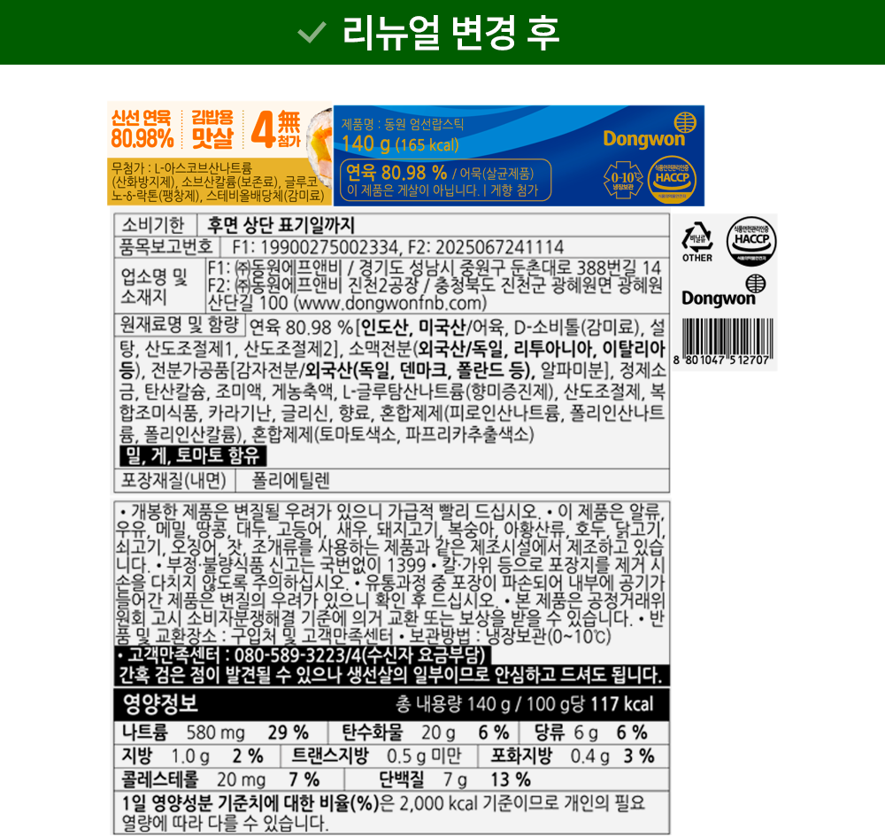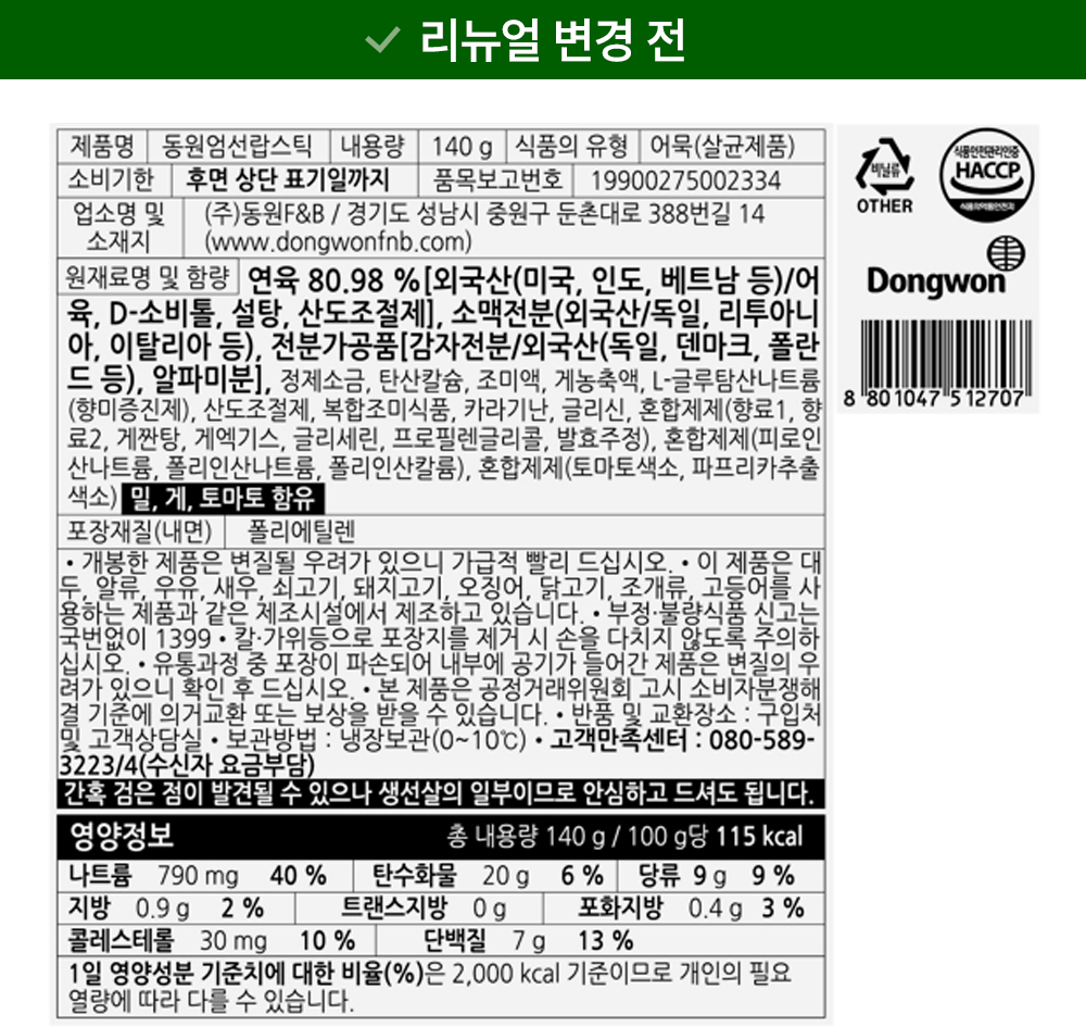 | 제품명 | 동원 엄선 랍스틱 | 식품의 유형 | 어묵 |