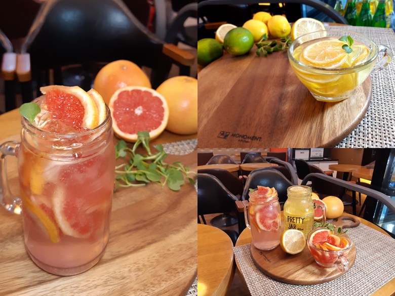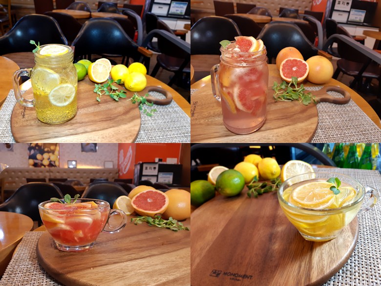 자몽에이드(14온스) : 자몽청 100g(슬라이스자몽 6조각+청액 3~4큰스픈) + 탄산수 180ml + 얼음적당