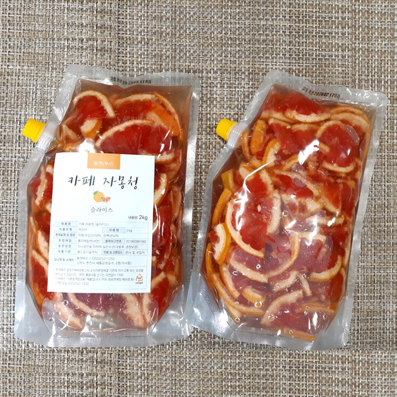 | 포장단위별 내용물의 용량(중량), 수량 | 2kg, 1개 | 원재료명 및 함량 | 자몽(수입) 50%, 정백당 50% |