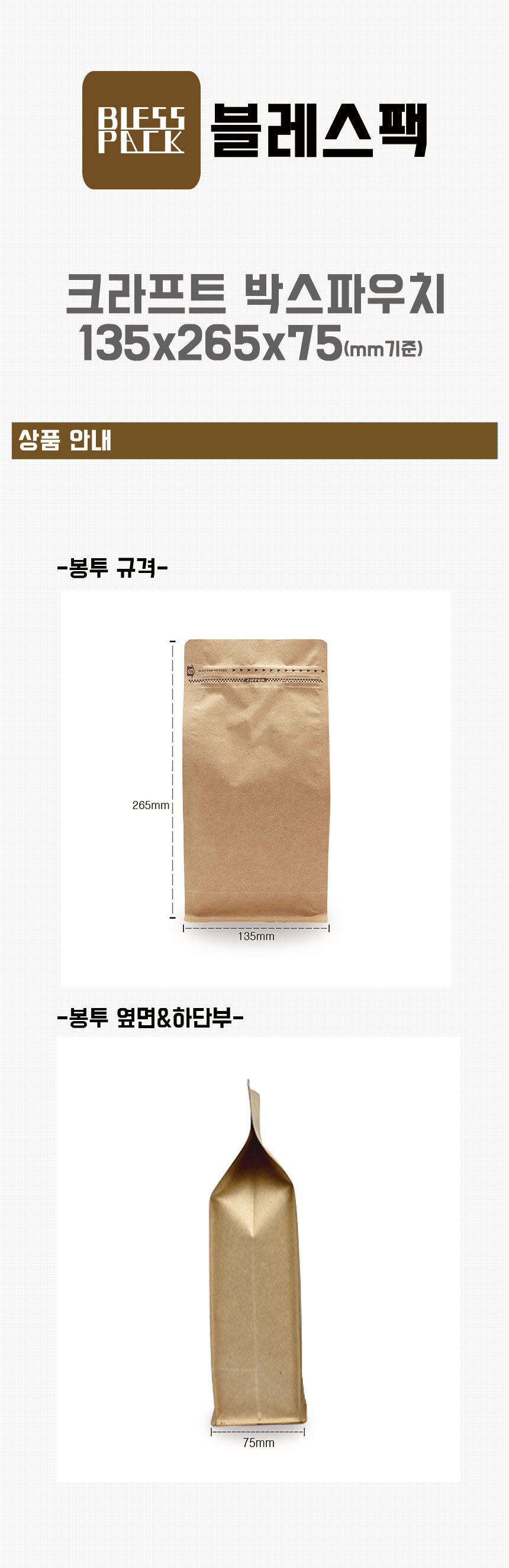 블레스팩 크라프트 박스 파우치 커피봉투 지퍼백 135 x 265 x 75 mm