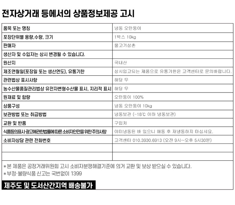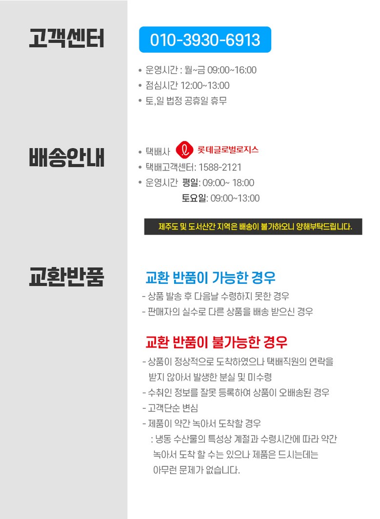 | 배송방법 | 신선/냉장/냉동 | 배송비 | 무료배송 - 도서산간 지역 배송불가 |