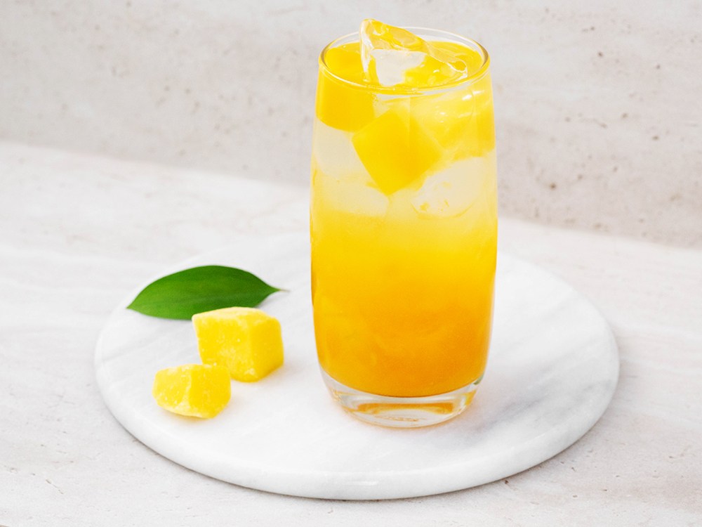 재료: 망고 다이스 적당량, 꿀 1큰술, 탄산수, 애플민트