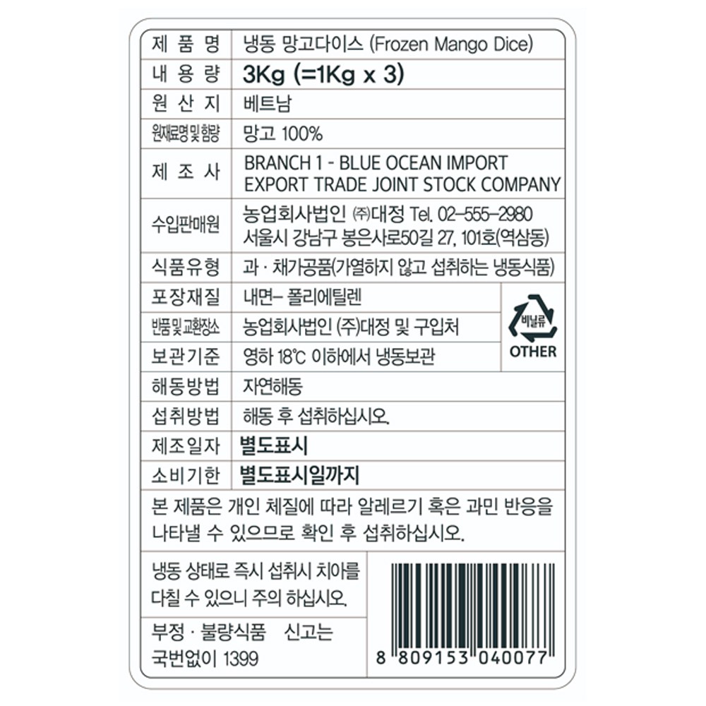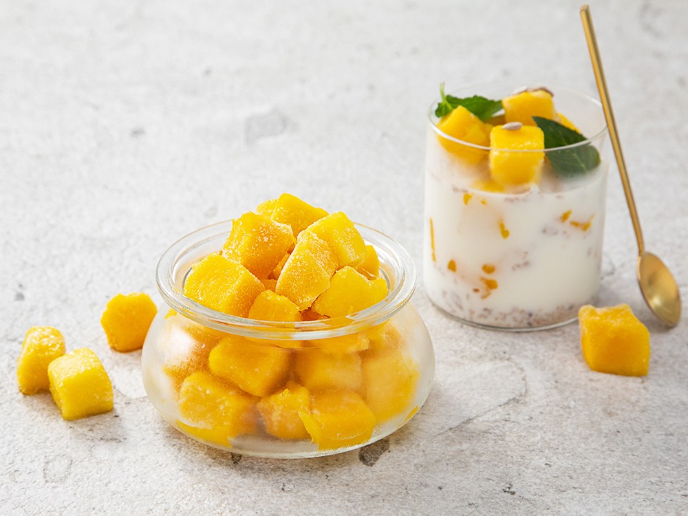 열대 과일의 여왕, 망고. 달콤하고 시원하게 녹아들어 더위와 갈증을 잊게 해줄 냉동 망고 다이스로 만나보세요. 큼지막하고 당도가 높아 진한 달콤함을 자랑하는 베트남산 망고로 엄선하여 먹기 좋게 잘라낸 후 시원하게 얼렸는데요. 망고 특유의 새콤달콤한 맛과 향을 고스란히 담아냈답니다. 선명한 노란빛이 보기만 해도 먹음직스러운 냉동 망고. 해동 후 그냥 먹어도 맛있지만 스무디, 빙수 등 다양한 디저트로 만들어도 좋아요.