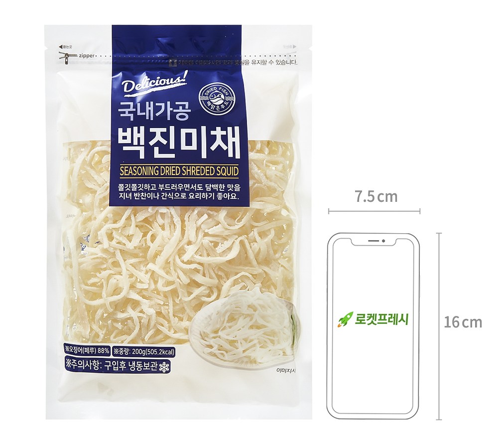오징어를 결대로 찢어 쫄깃쫄깃한 백진미채를 소개해요. 오징어 본연의 구수한 맛은 그대로지만, 껍질을 깔끔하게 벗겨내 담백한 맛이 더욱 두드러진답니다. 고추장에 버무려 반찬으로 드셔도 좋고 반죽을 입혀 튀겨 먹어도 별미예요. 쓰임이 많기에 두고두고 활용할 수 있지요.