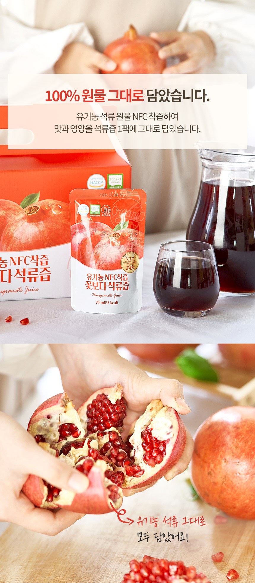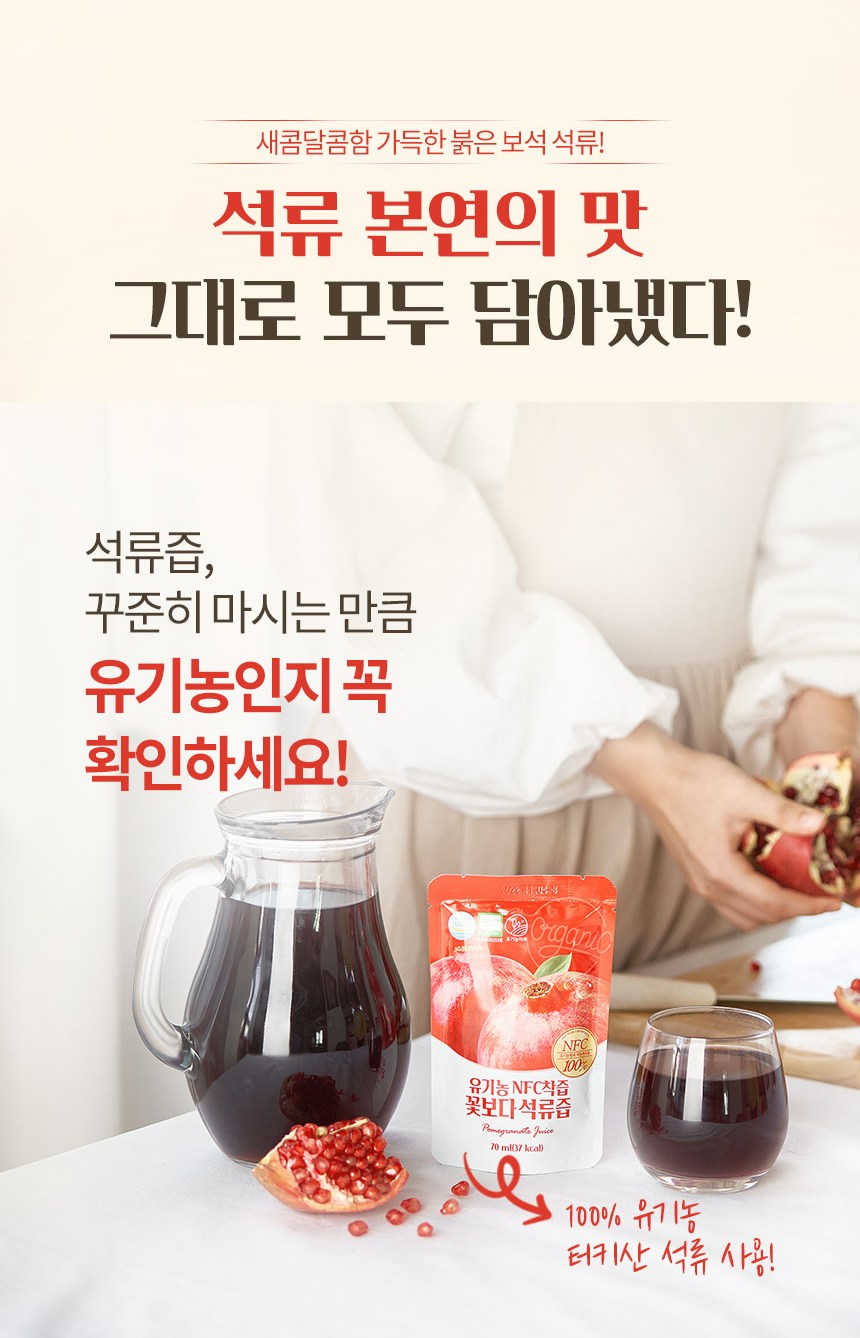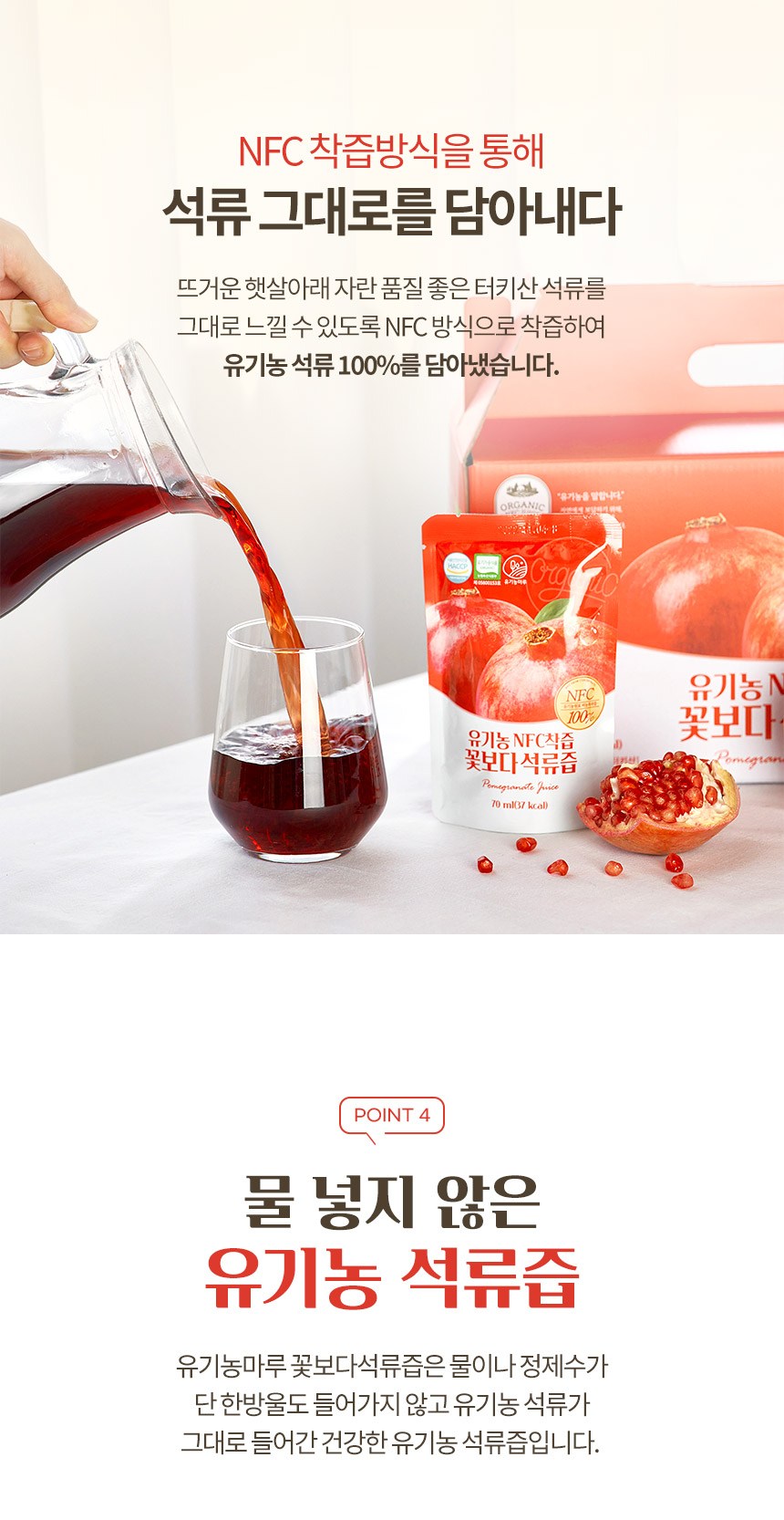 | 제품명 | 유기농 NFC착즙 꽃보다 석류즙 | 식품의 유형 | 과채주스 |