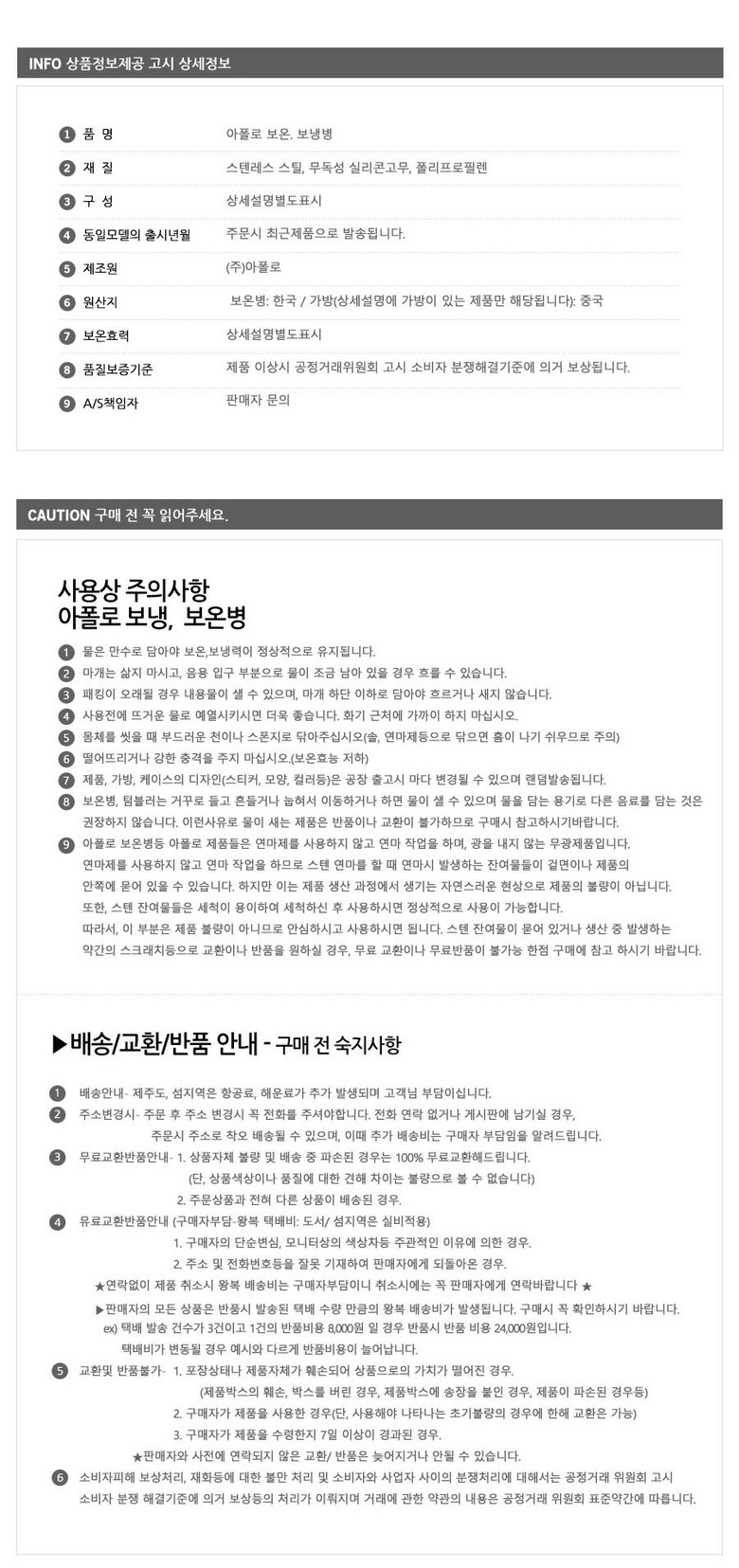 - ㆍ교환/반품에 관한 일반적인 사항은 판매자가 제시사항보다 관계법령이 우선합니다.