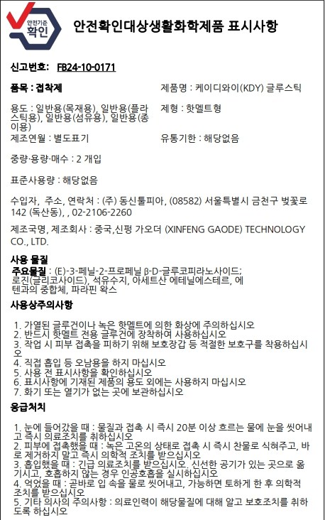 | 품목 및 제품명 | 접착제/ 케이디와이(KDY) 글루스틱 | 용도(표백제의 경우 계열을 함께표시) 및 제형 | 일반용 (목재용), 일반용 (섬유용), 일반용 (종이용), 일반용 (플라스틱용) / 핫멜트형 |