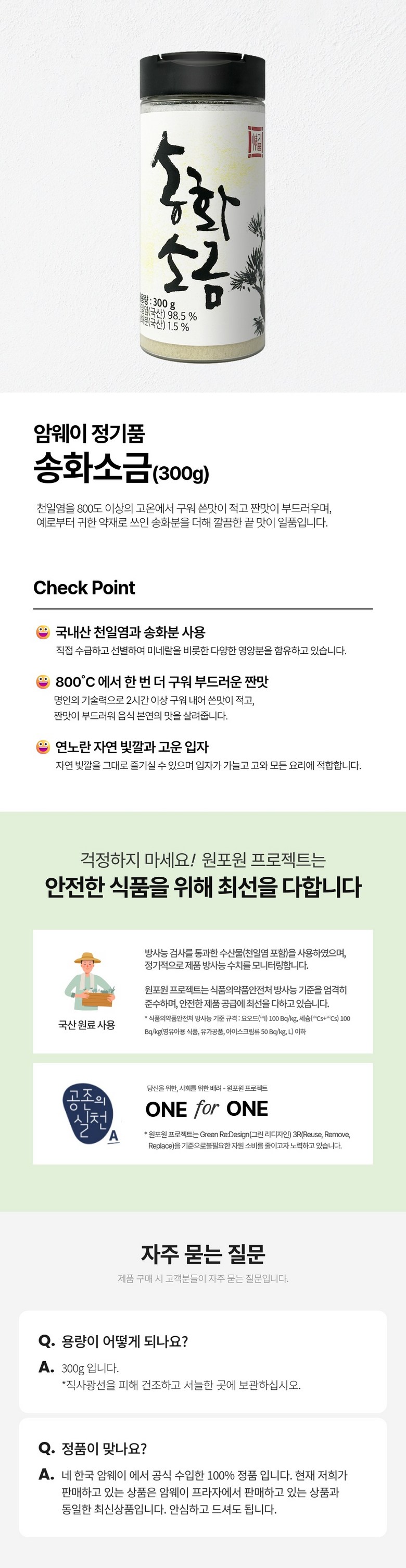 | 포장단위별 내용물의 용량(중량), 수량 | 300 g | 원재료명 및 함량 | 천일염(국산) 98.5 %, 송화분(국산) 1.5 % |