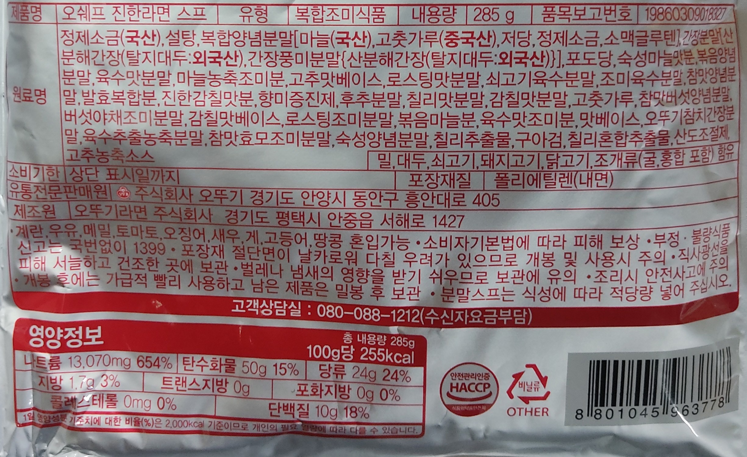 | 제품명 | 오쉐프 진한라면 스프 | 식품의 유형 | 복합조미식품 |