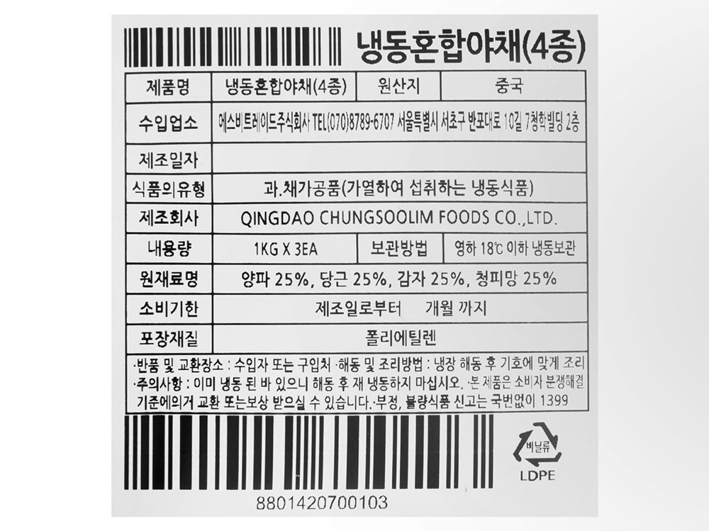 | 포장단위별 내용물의 용량(중량), 수량 | 1kg x 3개 | 원재료명 및 함량 | 컨텐츠 참조 |