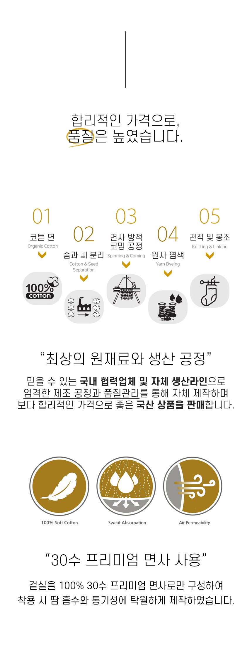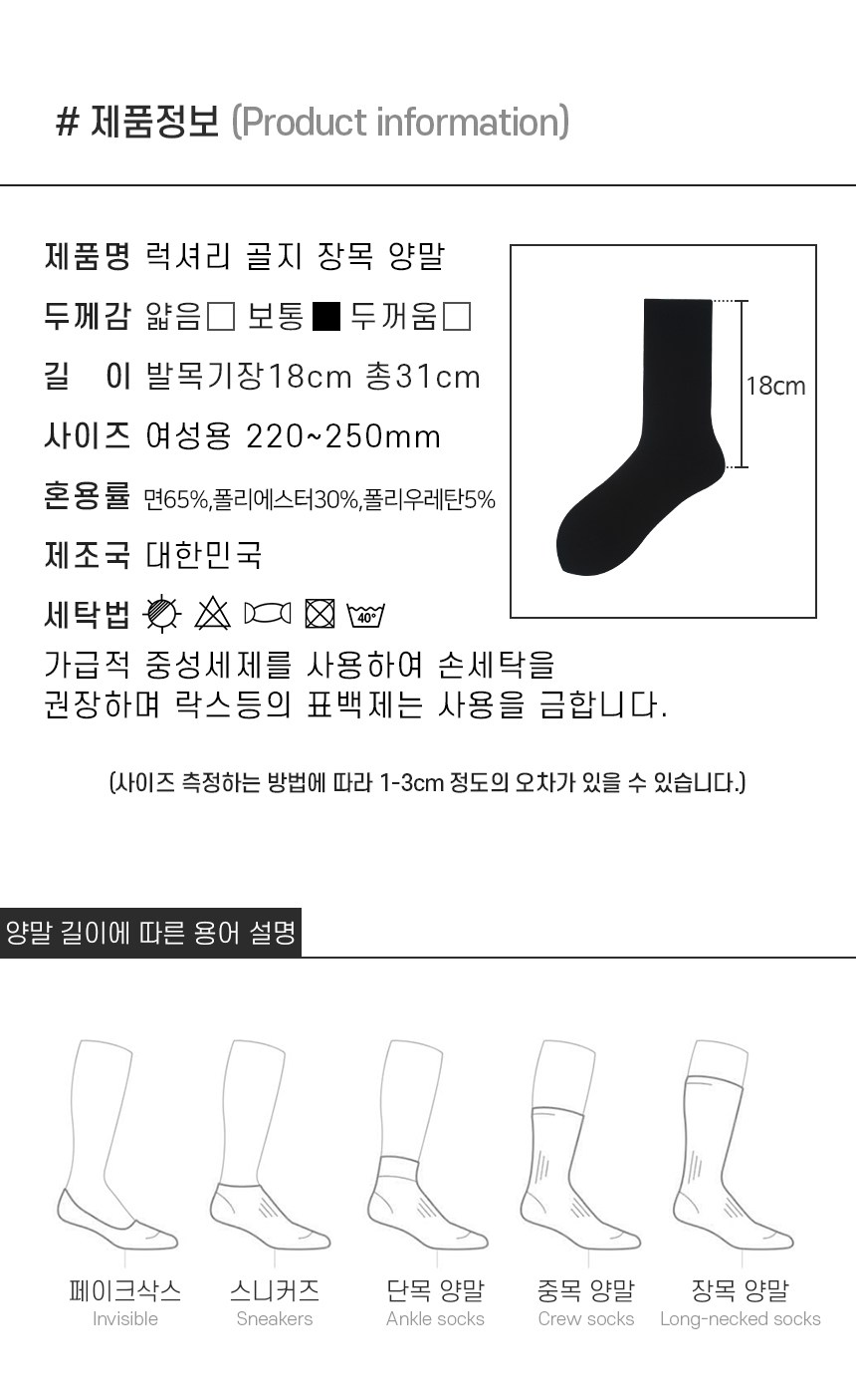 | 종류 | 장목 양말 | 소재 | 면65%, 폴리에스터30%, 폴리우레탄5% |