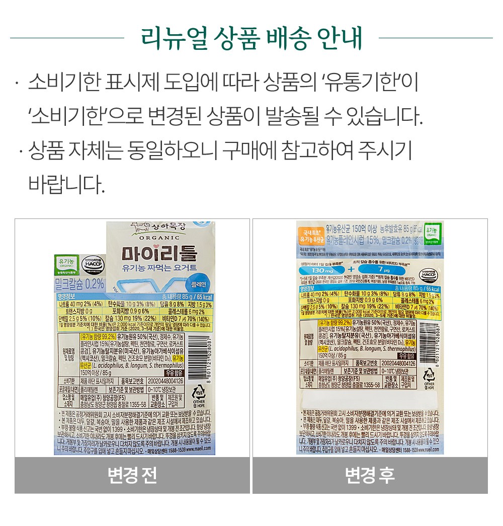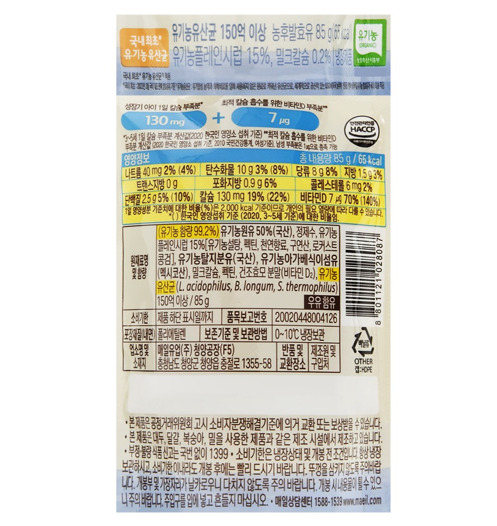 | 제품명 | 상하목장 마이리틀 유기농 짜먹는 요거트 플레인 | 식품의 유형 | 컨텐츠 참조 |