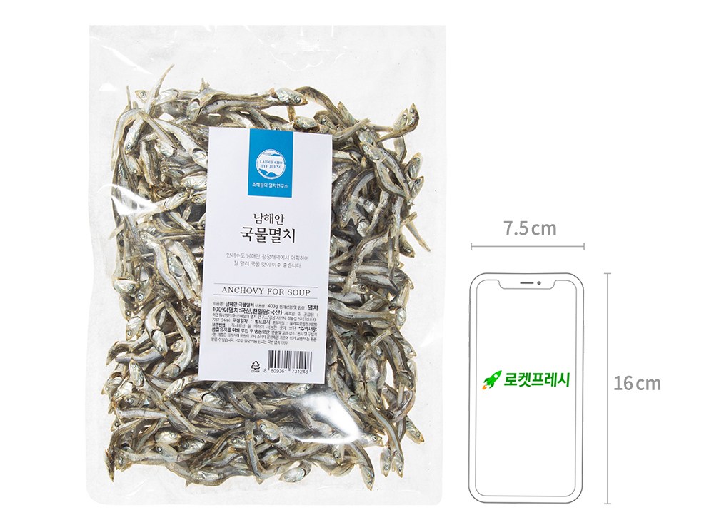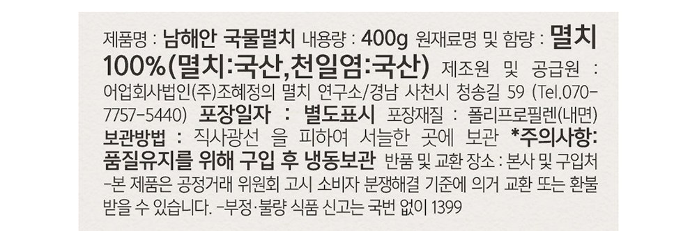 | 품목 또는 명칭 | 남해안 국물멸치 | 포장단위별 내용물의 용량(중량),수량,크기 | 400g x 2개,1개 |