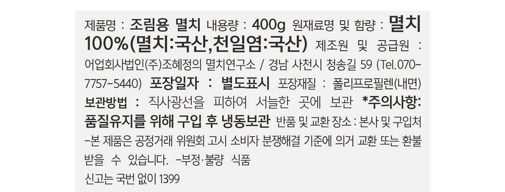 | 생산자(수입자) | 어업회사법인 ㈜조혜정의 멸치연구소 / 경남 사천시 청송길 59 | 원산지 | 컨텐츠 참조 |