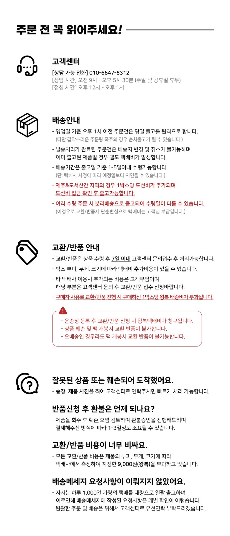 | 교환/반품 비용 (왕복비용) | 9,000원 - 단, 고객 변심의 경우에만 발생 - 도서산간 및 일부 지역 추가비용 발생 |