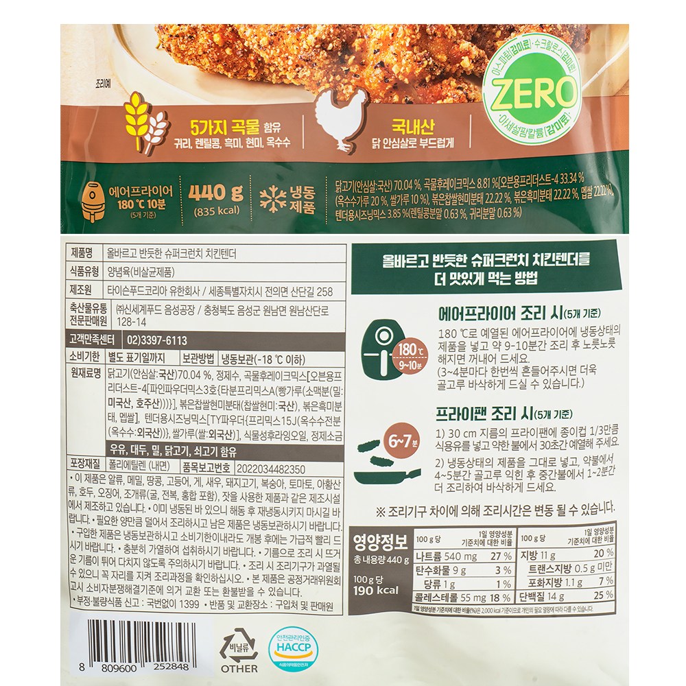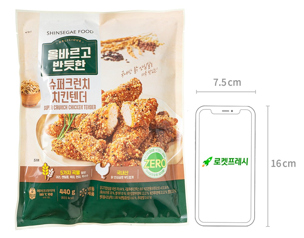 입안 가득 바삭함이 느껴지는 슈퍼크런치 치킨텐더예요. 닭고기 안심살을 사용해 속은 부드럽고 촉촉하지요. 닭고기의 담백함과 곡물 후레이크 믹스의 고소함이 조화롭게 어우러진답니다. 에어프라이어나 프라이팬으로 간편하게 조리해, 맛있는 한 끼를 즐겨보세요.