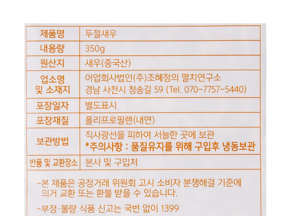 | 품목 또는 명칭 | 두절새우 | 포장단위별 내용물의 용량(중량),수량,크기 | 350g x 2개,1개 |