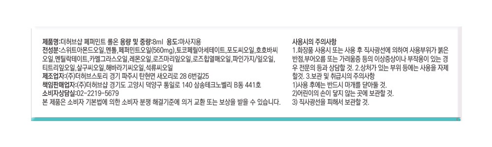 | 사용기한 또는 개봉 후 사용기간 | 본 상품은 해당 물류센터 직발송 상품인 관계로 제조연월일 및 사용기한 정보가 매번 변경되므로 상단 사용기한 정보를 참고해 주세요. | 사용방법 | 뚜껑을 열고 뒷목, 귀밑, 림프관, 어깨 근육, 손목 등에 적당히 롤링해주세요 |