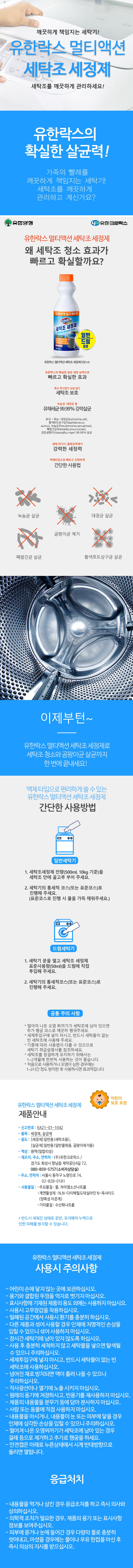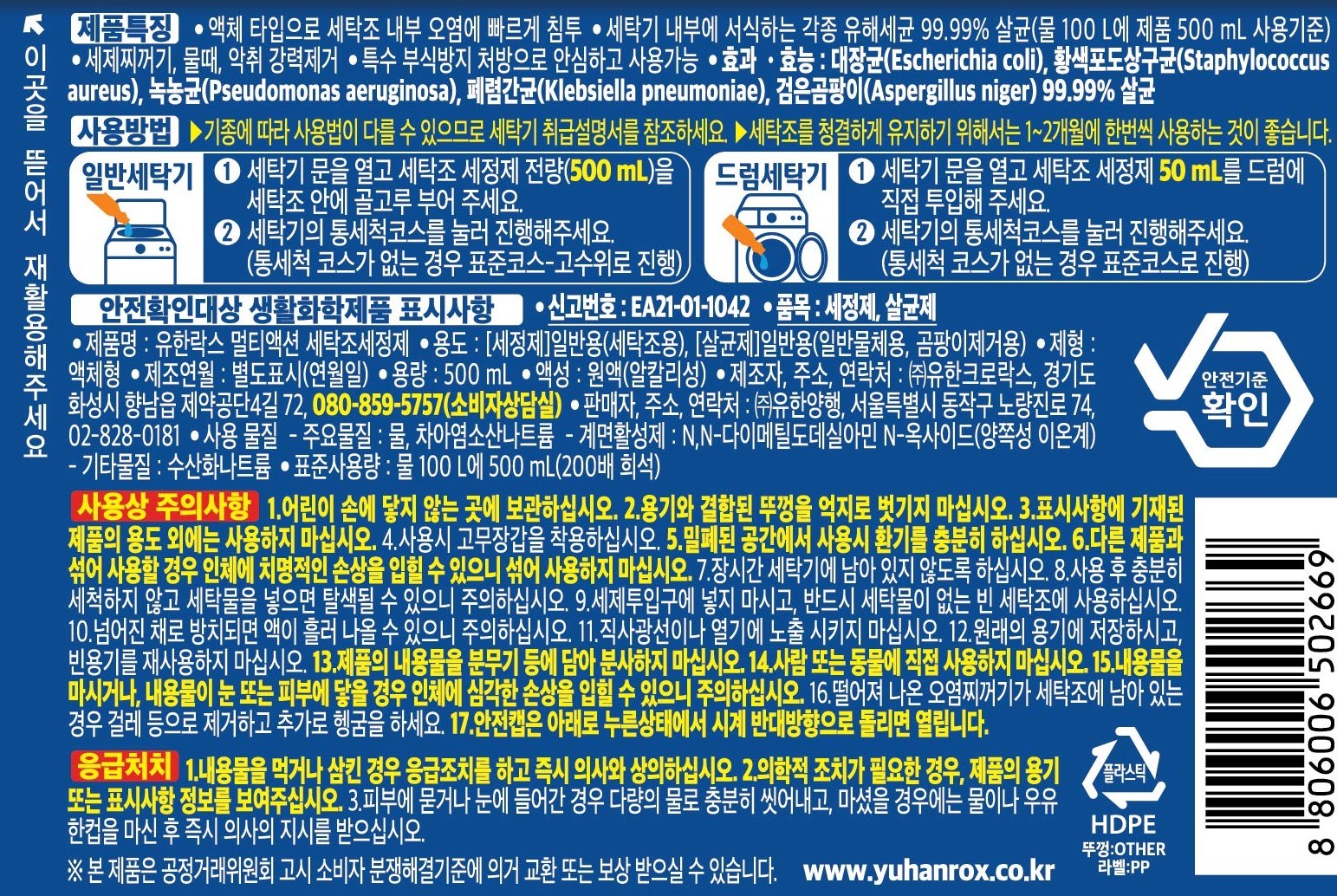 | 품목 및 제품명 | 세정제,살균제 / 유한락스 멀티액션 세탁조세정제 | 용도(표백제의 경우 계열을 함께표시) 및 제형 | 일반용-세탁조용,일반용-일반물체용,일반용-곰팡이제거용 / 액체형 |