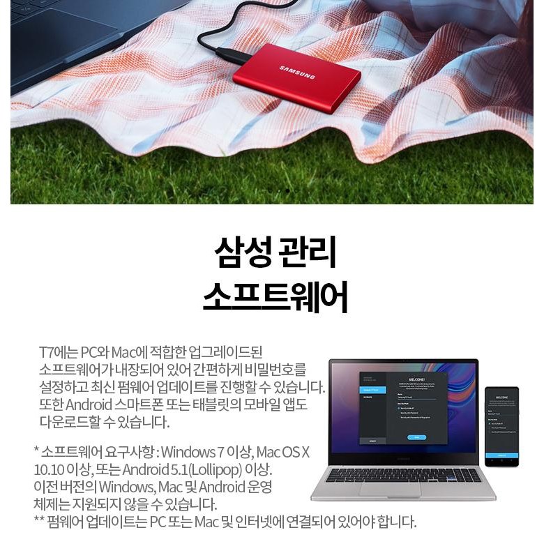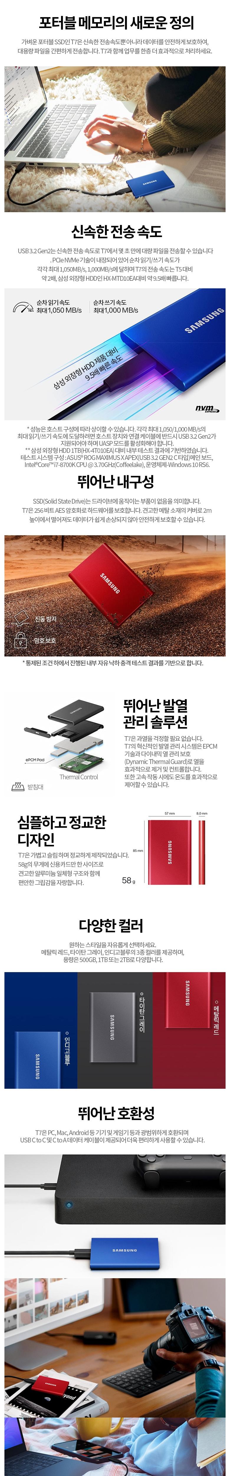 삼성 외장 SSD T7 × 1개, USB3.2 연결케이블 Type C 투 Type C × 1개, USB3.2 연결케이블 Type C 투 Type A (USB3.2 Gen 2 연결케이블 지원) × 1개, 사용설명서 × 1개, 패키지 케이스 × 1개
