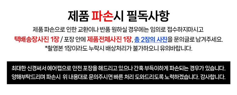 | 교환/반품 신청 기준일 | ㆍ단순변심에 의한 교환/반품은 제품 수령 후 7일 이내까지, 교환/반품 제한사항에 해당하지 않는 경우에만 가능 (배송비용과 교환/반품 비용 왕복배송비 고객부담) ㆍ상품의 내용이 표시·광고의 내용과 다른 경우에는 상품을 수령한 날부터 3개월 이내, 그 사실을 안 날 또는 알 수 있었던 날부터 |