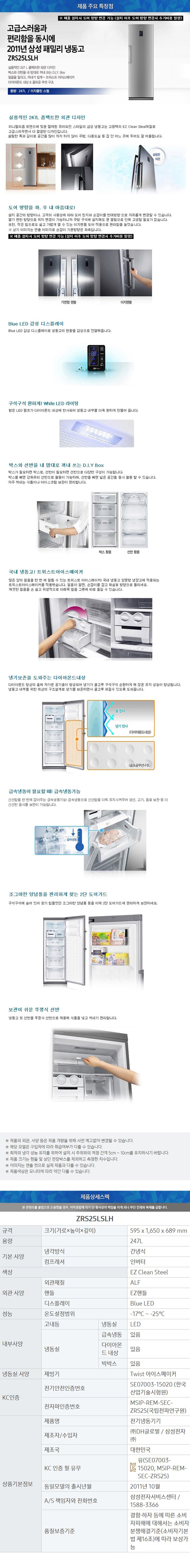| 품명 및 모델명 | 삼성전자 패밀리 냉동고, 실버, ZRS25LSLH | KC 인증정보 | SE07003-15020A, MSIP-REM-SEC-ZRS25 |