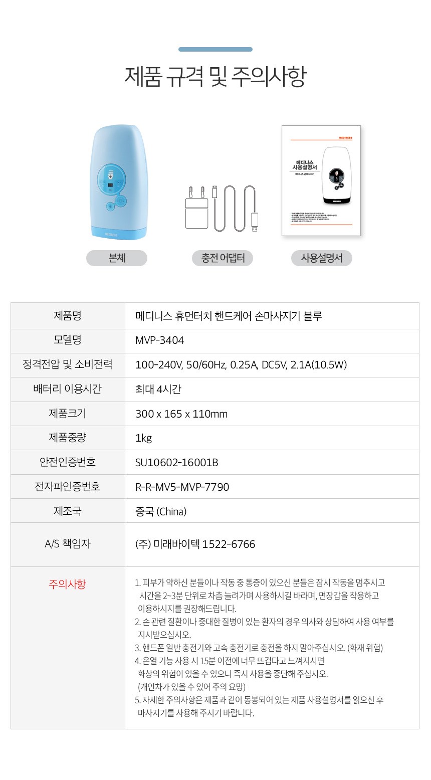 | 품명 및 모델명 | 굿터치 핸드케어 / MVP-3404 | KC 인증정보 | 본품 :R-R-MV5-MVP-7790 / 어댑터 : SU10602-16001B |