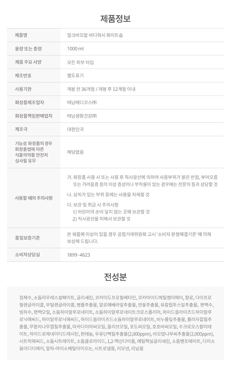 | 용량(중량) | 1000ml | 제품 주요 사양 | 모든 피부용 |