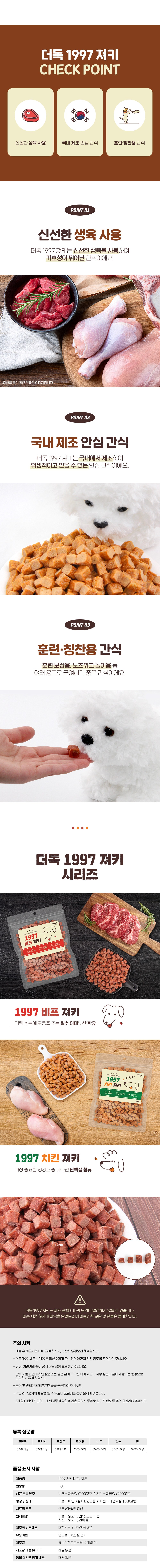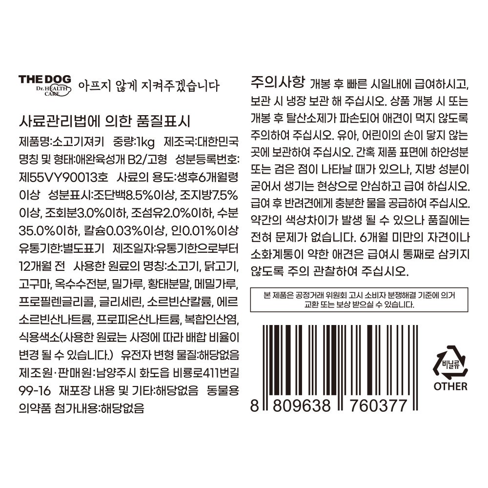 | 품명 및 모델명 | 소고기져키 | 인증/허가 사항 | 사료관리법에 따른 성분등록번호 : 컨텐츠 참조 |