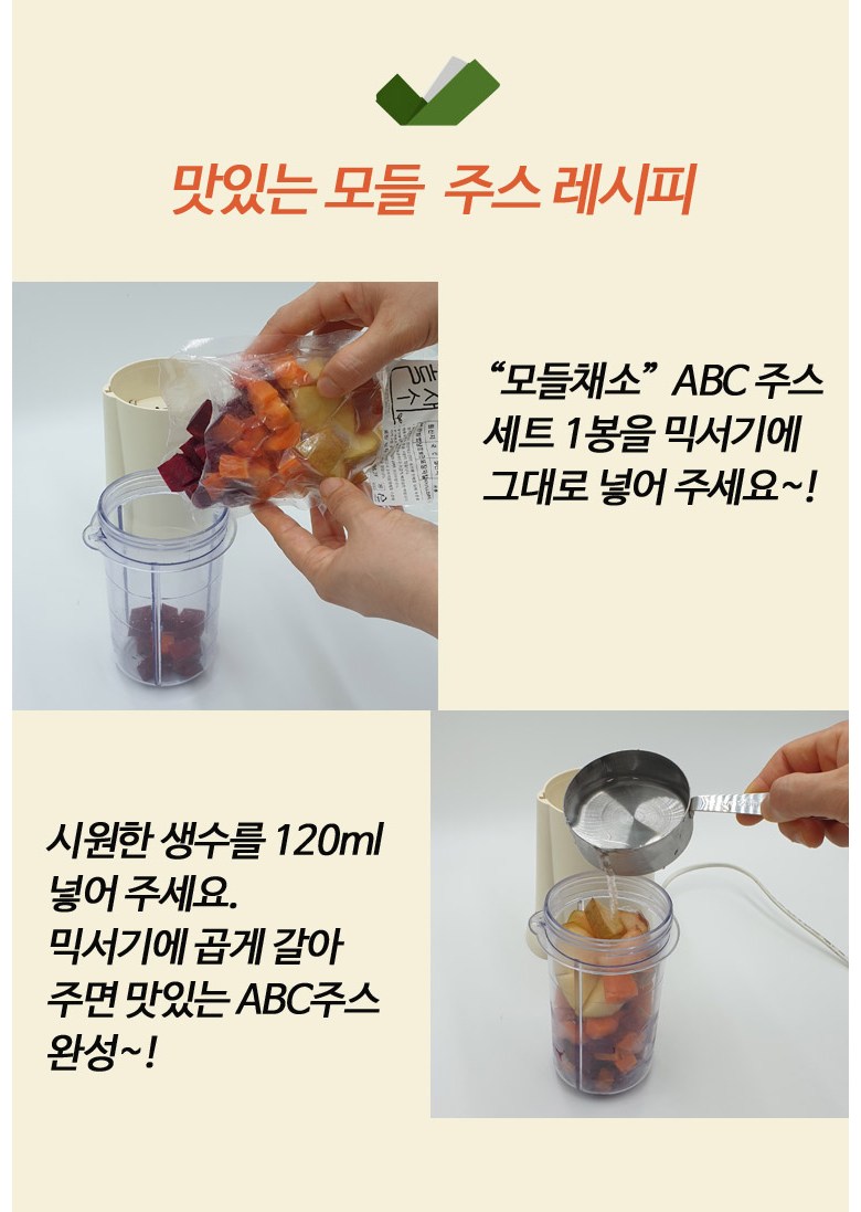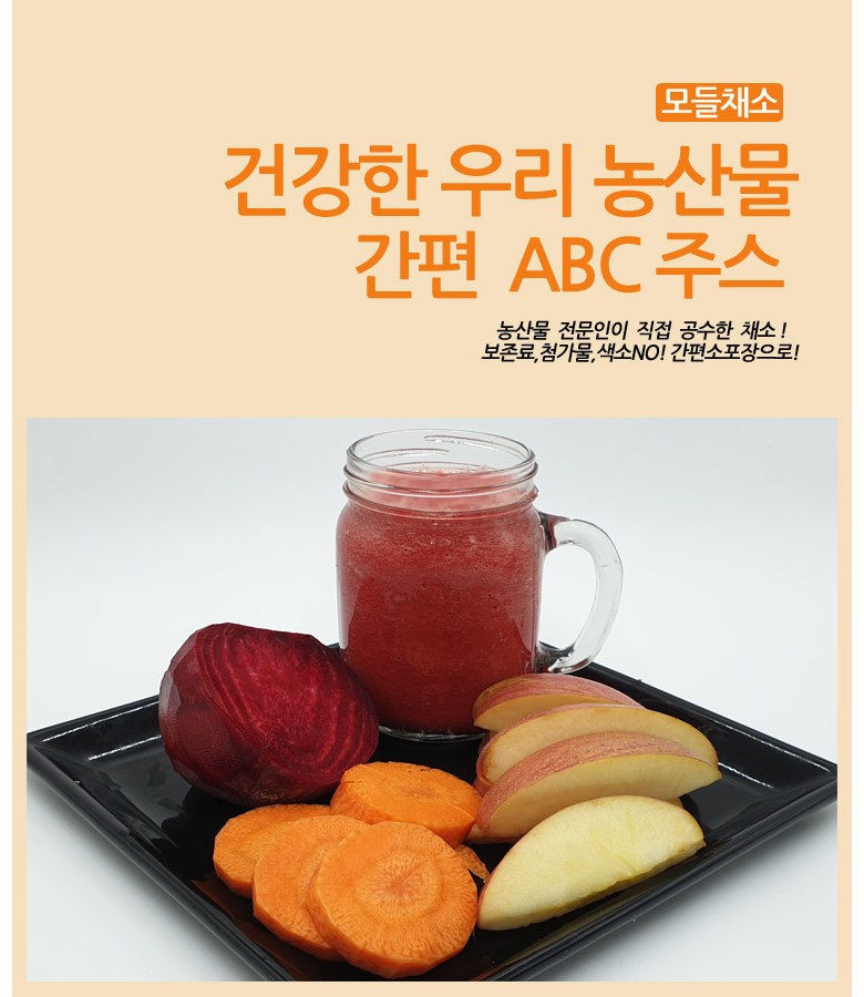 | 포장단위별 내용물의 용량(중량),수량,크기 | ABC주스 1팩사과(100g)+비트(30g)+당근(30g) 1팩 | 생산자(수입자) | 생산자 : 제이앤제이유통 |