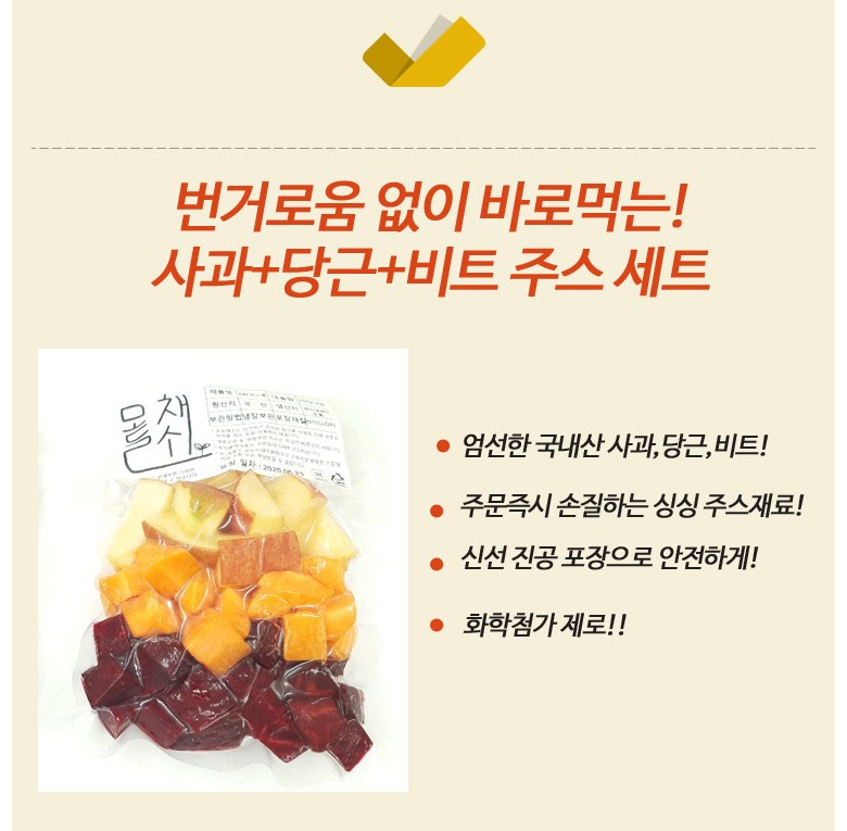 | 원산지 | 사과:국산비트:국산당근:국산 | 제조연월일, 소비기한 또는 품질유지기한 | 생산년도:2020제조연월일:주문즉시제조유통기한:빠른섭취를 권장합니다. |