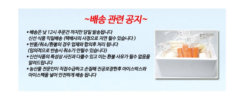 | 배송방법 | 신선/냉장/냉동 | 배송비 | 3,500원 - 19,800원 이상 구매 시 무료배송 · 도서산간 추가 배송비 - 제주 지역: 3,500원 - 도서산간 지역: 8,000원 |