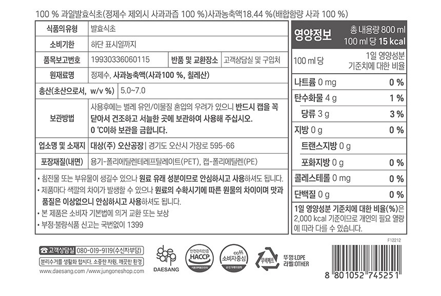 - 신선하고 품질 좋은 사과를 자연 발효하여 만든 식초