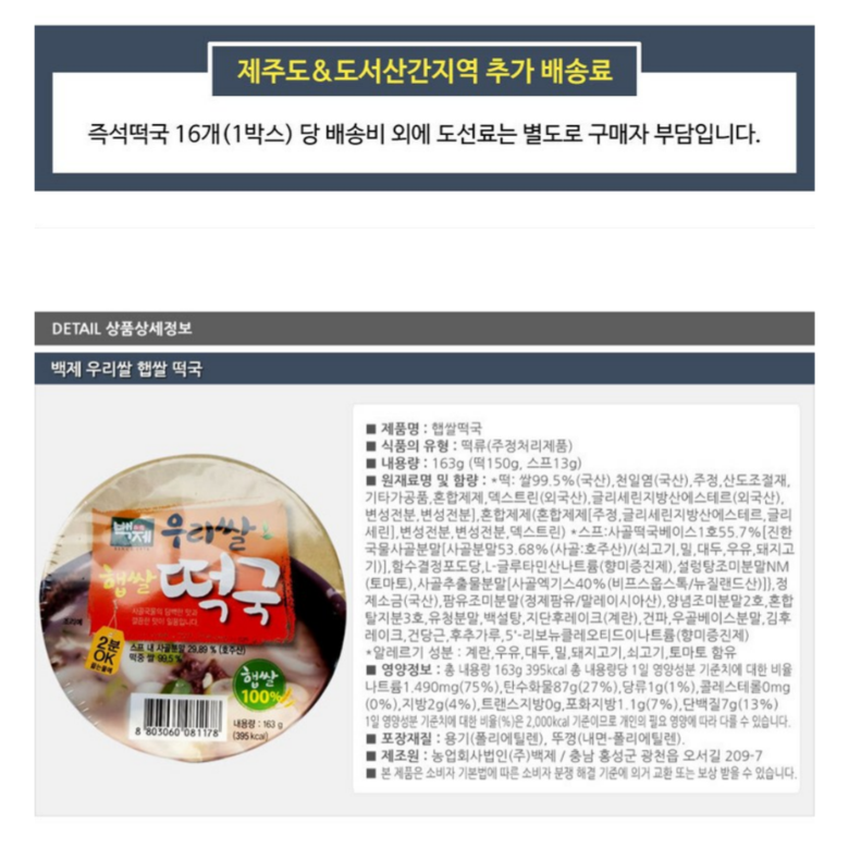 | 생산자 및 소재지 | 상품 상세페이지 참조 | 제조연월일, 소비기한 또는 품질유지기한 | 상품 상세페이지 참조 |