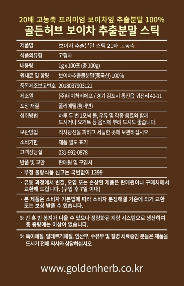 | 포장단위별 내용물의 용량(중량), 수량 | 1g x 100스틱, 1개 | 원재료명 및 함량 | 컨텐츠 참조 |