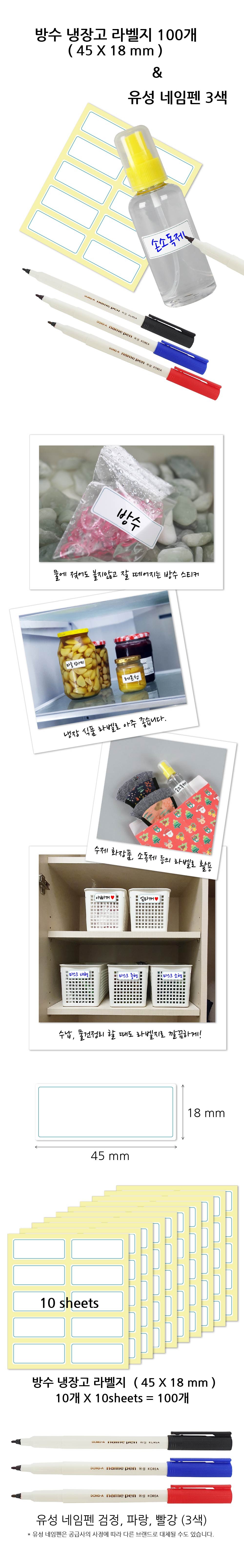 | 품명 및 모델명 | 연두앵두 방수 냉장고 라벨지 100개 (45X18mm) + 네임펜 3개 (검정,파랑,빨강) | 인증/허가 사항 | 해당없음(14세이상) |
