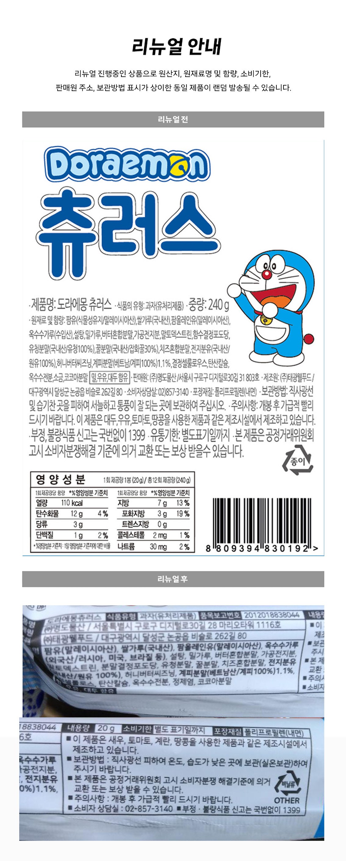 | 제품명 | 도라에몽 츄러스 | 식품의 유형 | 과자(유처리제품) |