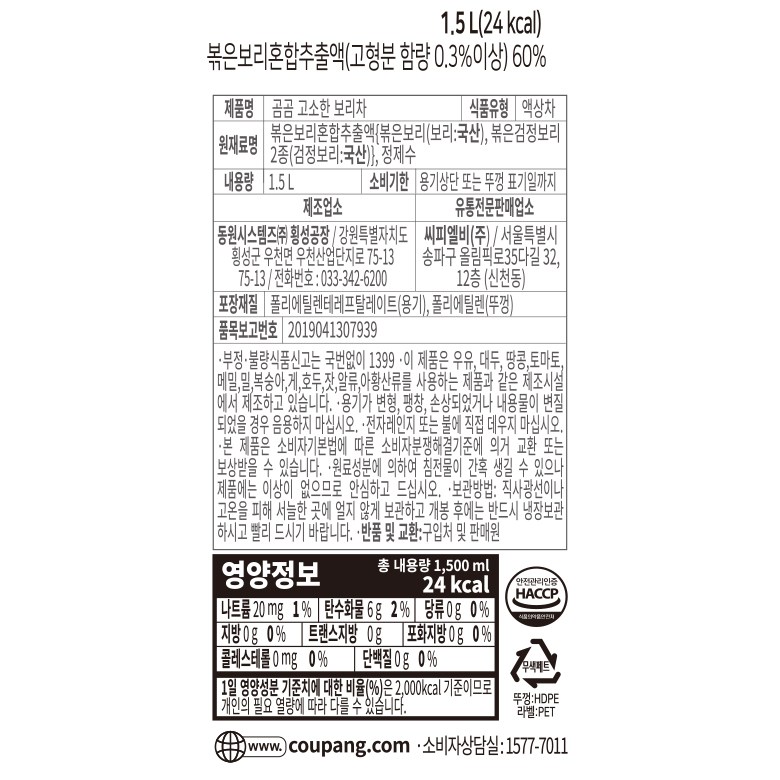| 포장단위별 내용물의 용량(중량), 수량 | 1.5L x 12개, 2개 | 원재료명 및 함량 | 컨텐츠 참조 |