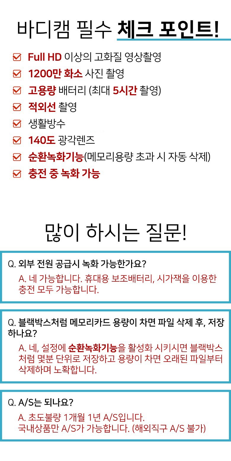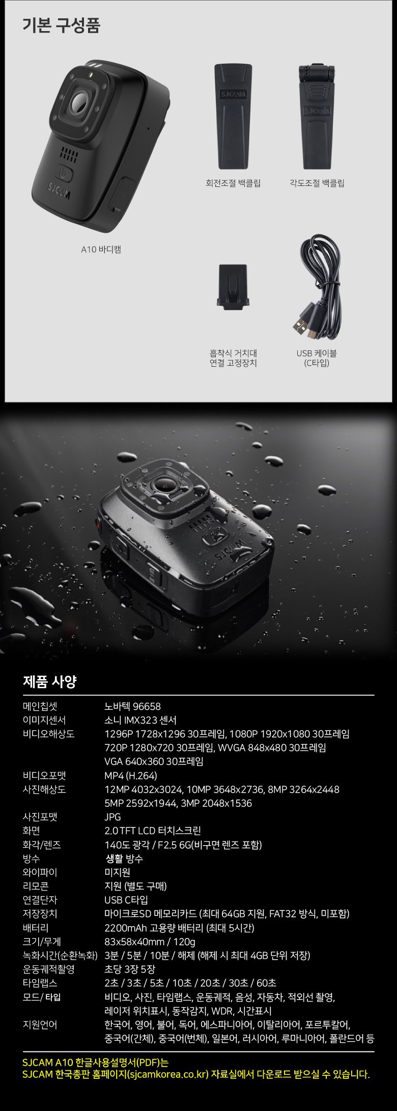- 구성품: A10 바디캠 + 회전조절 백클립 + 각도조절 백클립 + 흡착식 거치대 연결 고정장치 + USB케이블 (C타입)