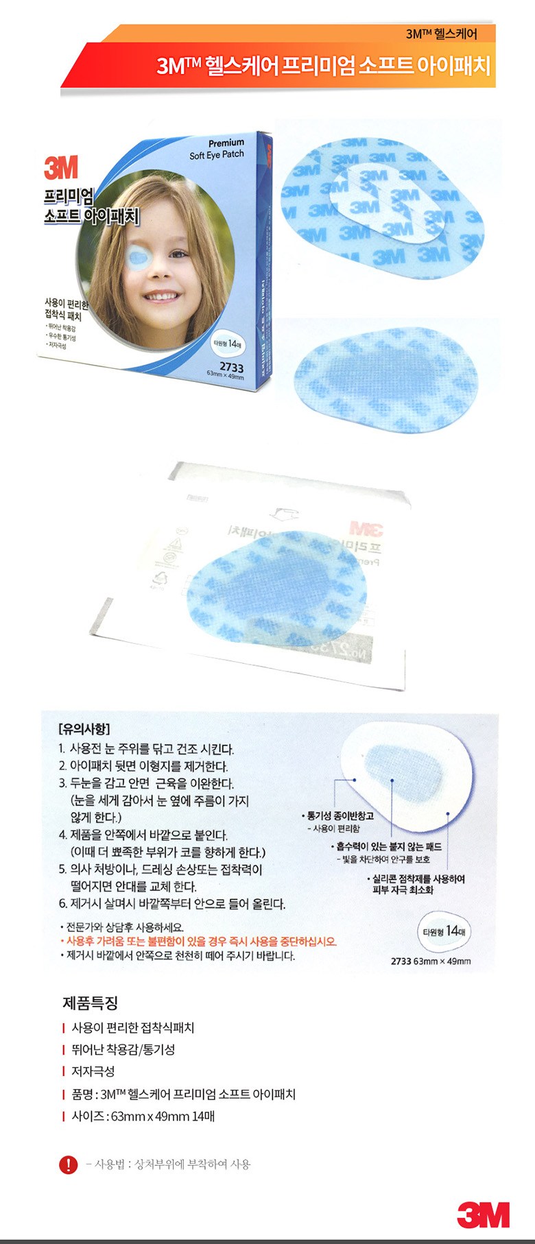 | 품명 및 모델명 | 3M 헬스케어 프리미엄 소프트 아이패치 14매입 63mm x 49mm | 인증/허가 사항 | 의약외품 |
