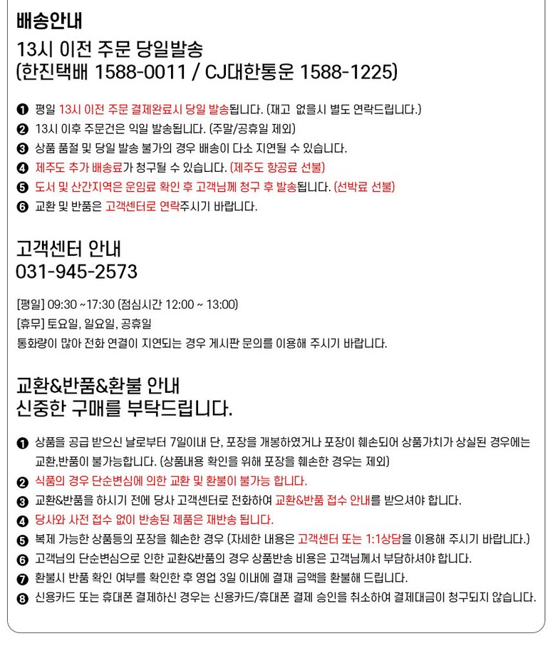 - ㆍ교환/반품에 관한 일반적인 사항은 판매자가 제시사항보다 관계법령이 우선합니다.