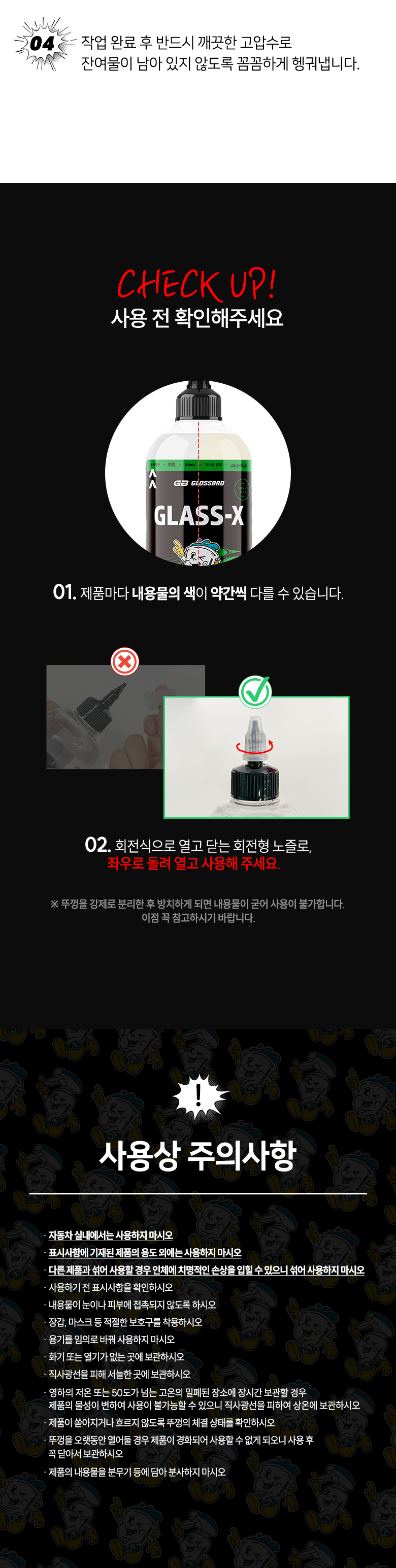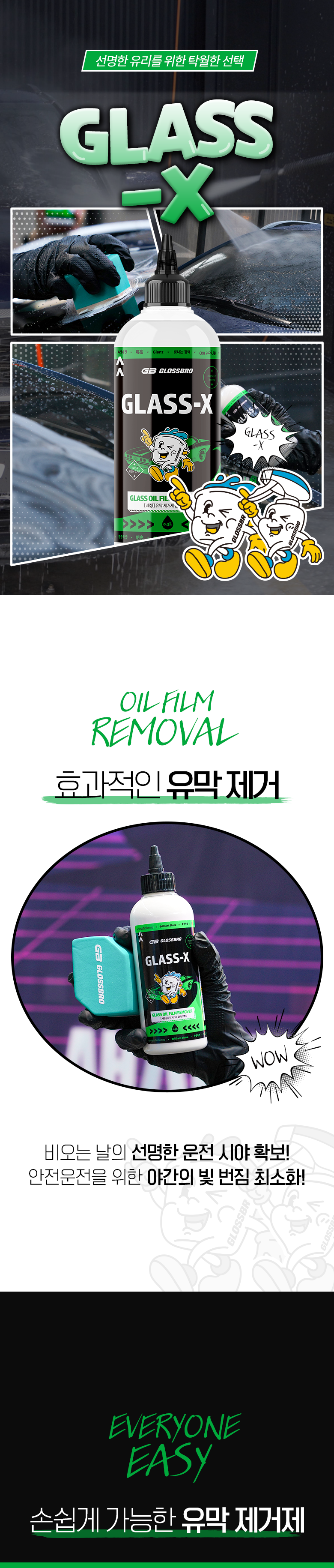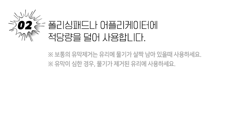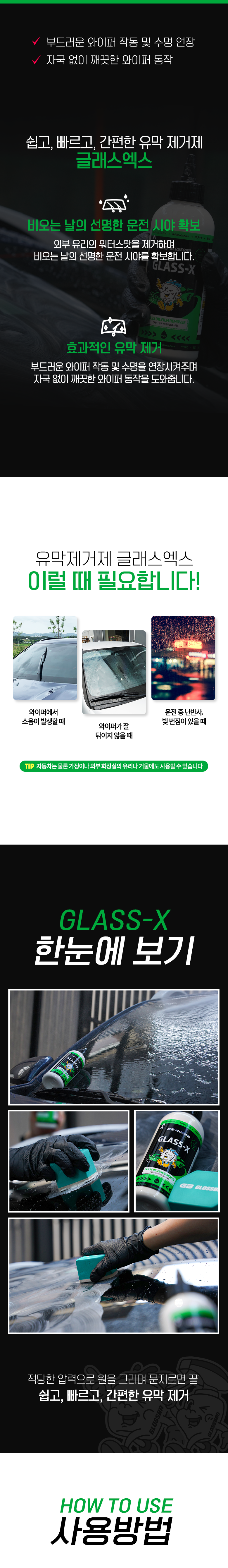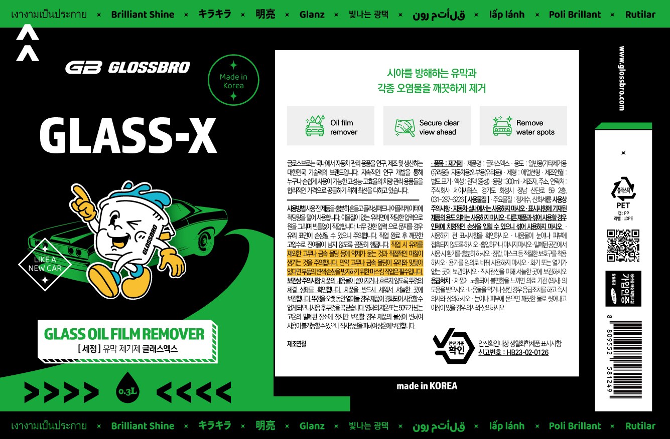 | 품목 및 제품명 | 제거제 / 글래스엑스 | 용도(표백제의 경우 계열을 함께표시) 및 제형 | 일반용-기타제거용-유리용,자동차용-외부용-유리용 / 에멀션형 |