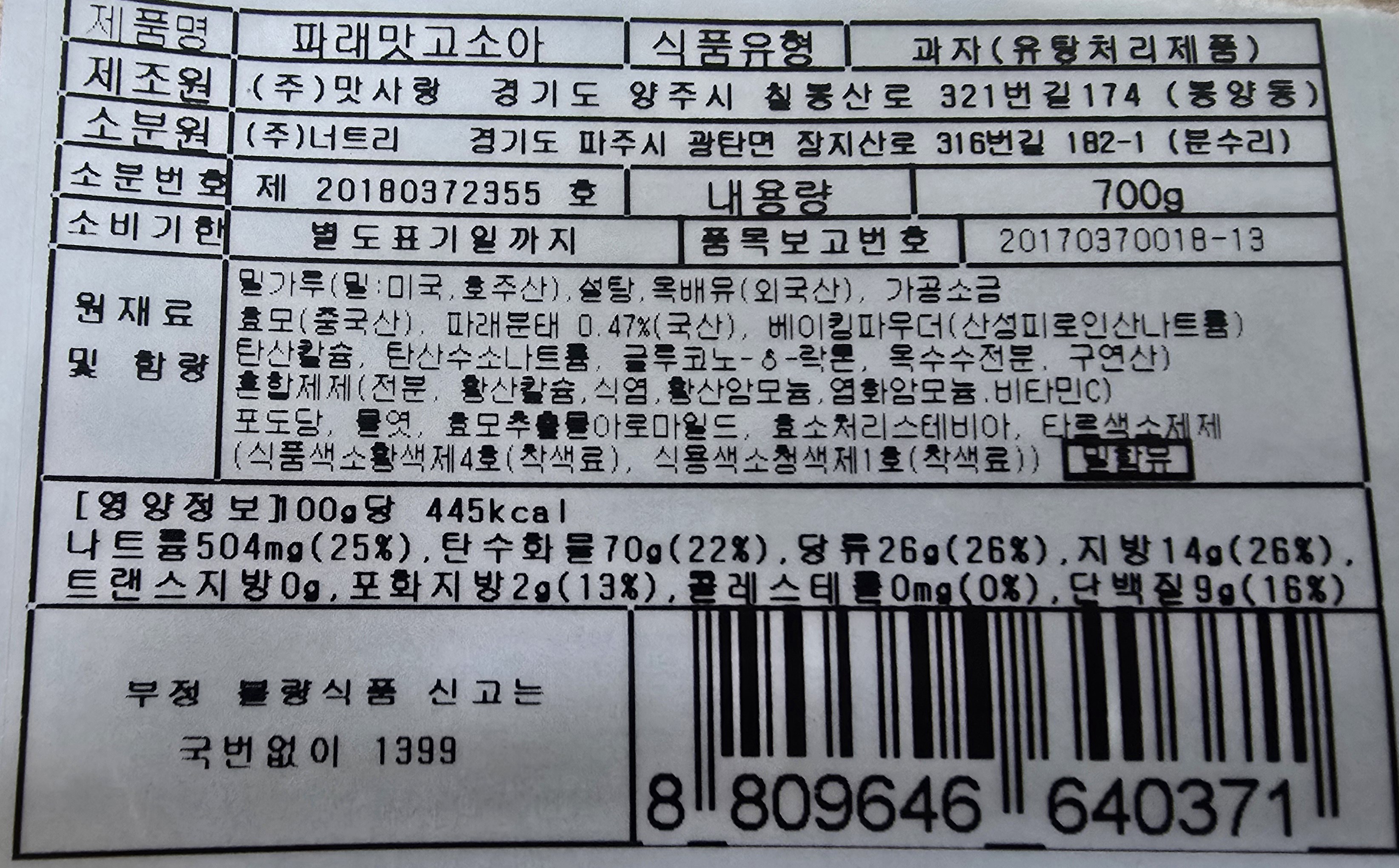 | 포장단위별 내용물의 용량(중량), 수량 | 700g, 1개 | 원재료명 및 함량 | 컨텐츠 참조 |