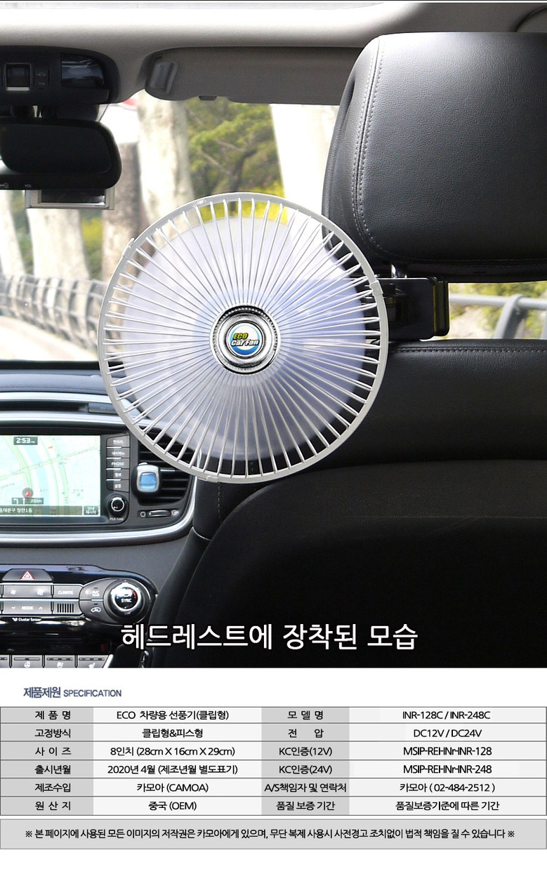 | 품명 및 모델명 | 카모아 에코카팬 차량용 선풍기 | KC 인증정보 | 상품 상세페이지 참조 |