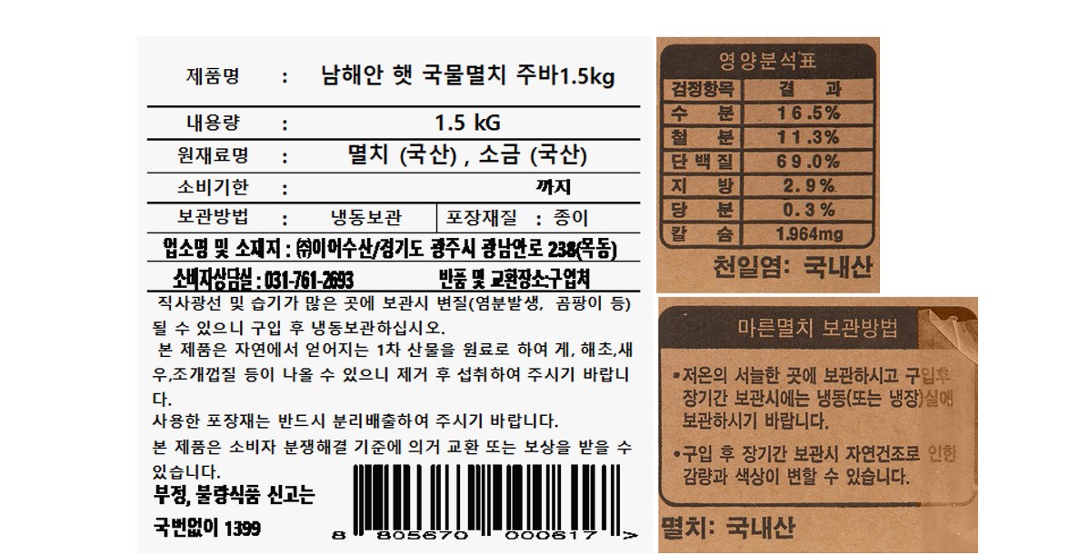 자연에서 얻어진 1차 산물로 멸치 외 해초, 새우, 조개껍데기, 기타 바다생물 등의 이종이 혼입되어 있을 수 있습니다. 선별하시어 용도에 맞게 사용하세요. 또한 외관과 형태는 예쁘지 않을 수 있으나, 국물내기용으로 적합한 멸치입니다.