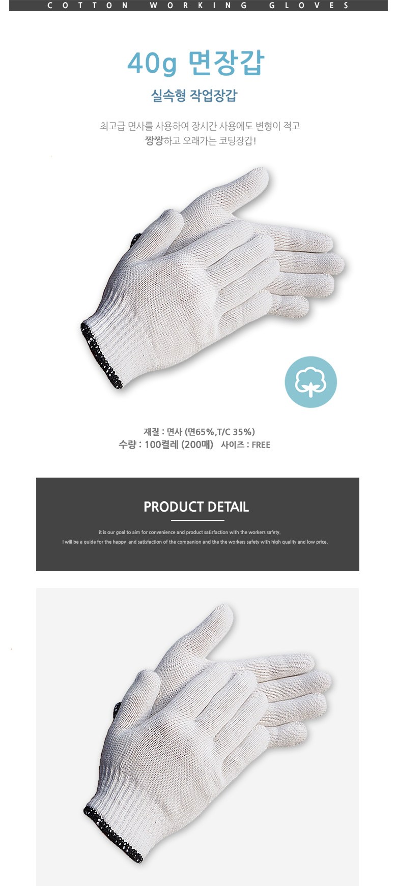 | 품명 및 모델명 | 40g 면장갑 | 인증/허가 사항 | 해당사항 없음 |