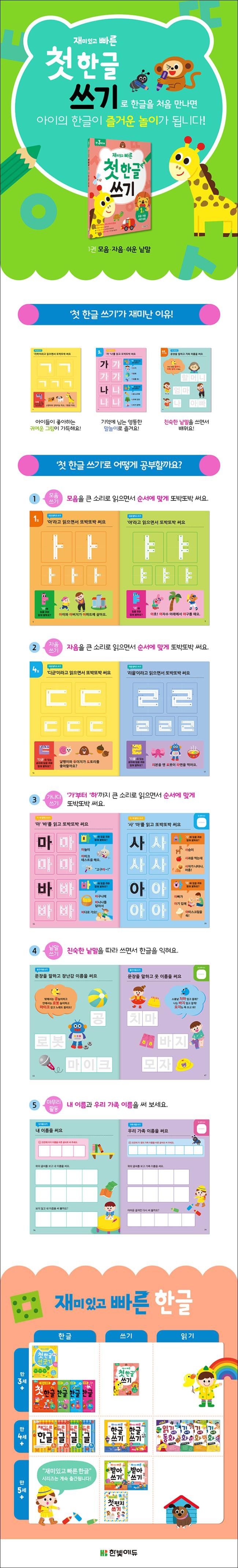 | 도서명 | [한빛에듀]재미있고 빠른 첫 한글 쓰기 1 : 모음.자음.쉬운 낱말 | 저자, 출판사 | 한빛에듀,한빛학습연구회 |