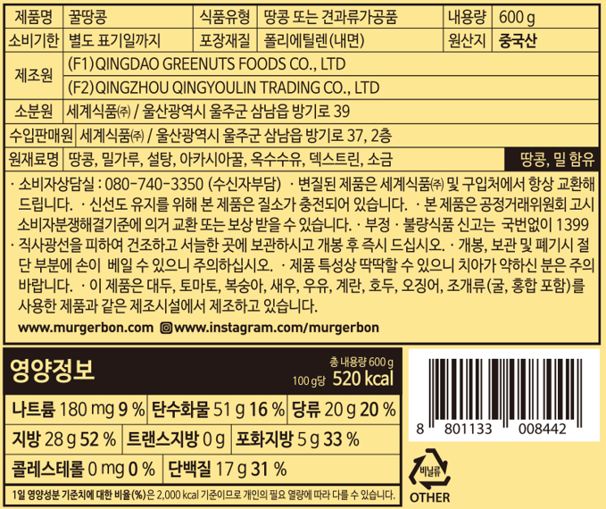 - 견과 종류: 땅콩