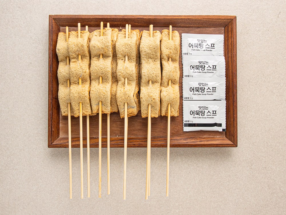 쫄깃한 꼬치어묵을 소개할게요. 조리 후에도 탱글탱글한 특유의 식감이 살아있답니다. 한 입 베어 물면, 부드럽고 고소한 풍미가 입안 가득 퍼지죠. 동봉된 맛있는 어묵탕 스프를 사용해 시원한 어묵탕을 끓이셔도 좋고요. 육수에 넣고 조리해, 분식에 곁들여 드셔도 맛있어요.