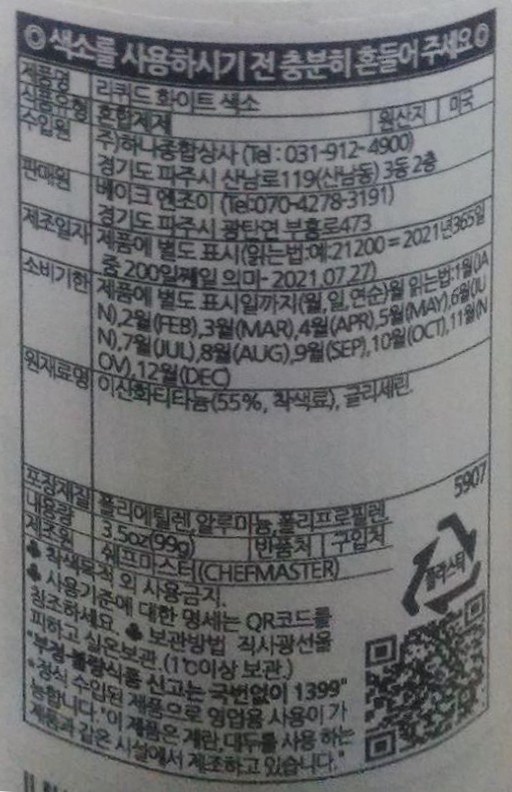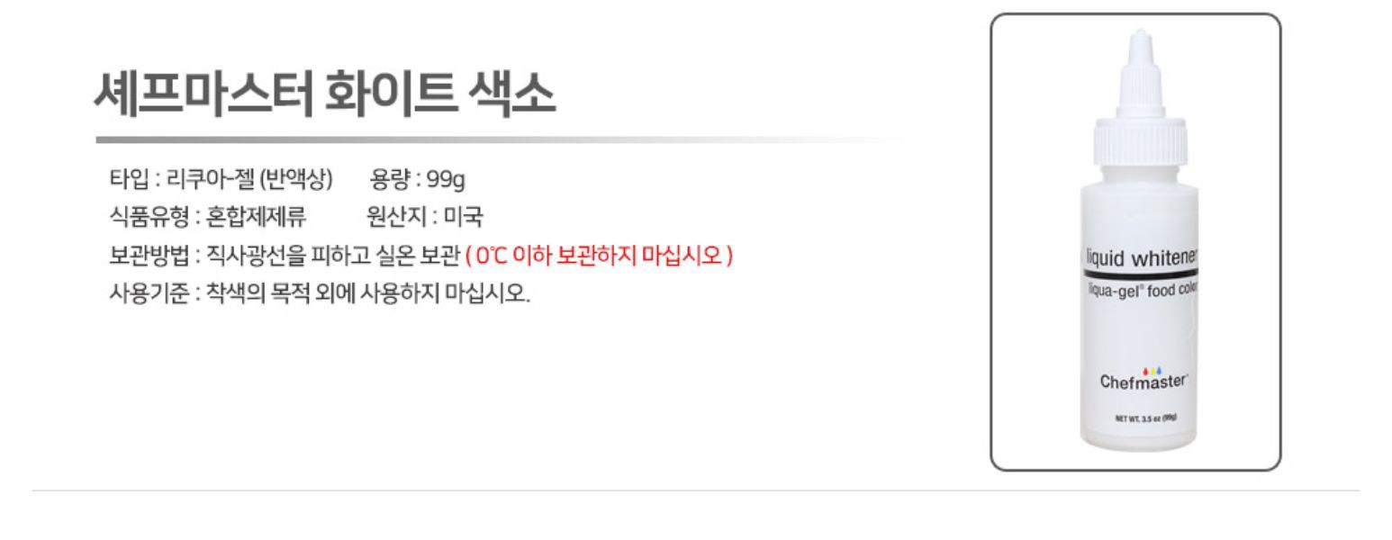 | 제품명 | 리퀴드 화이트 색소 | 식품의 유형 | 컨텐츠 참조 |